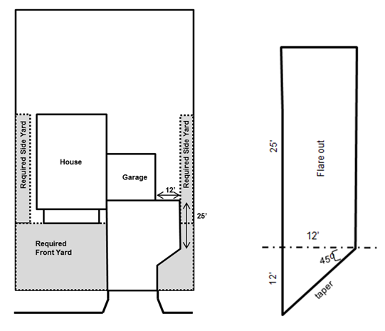 A driveway may have a flare out in the front yard or side yard area of the property only if the entire flare out portion meets all of the following requirements (refer to figure 6):
