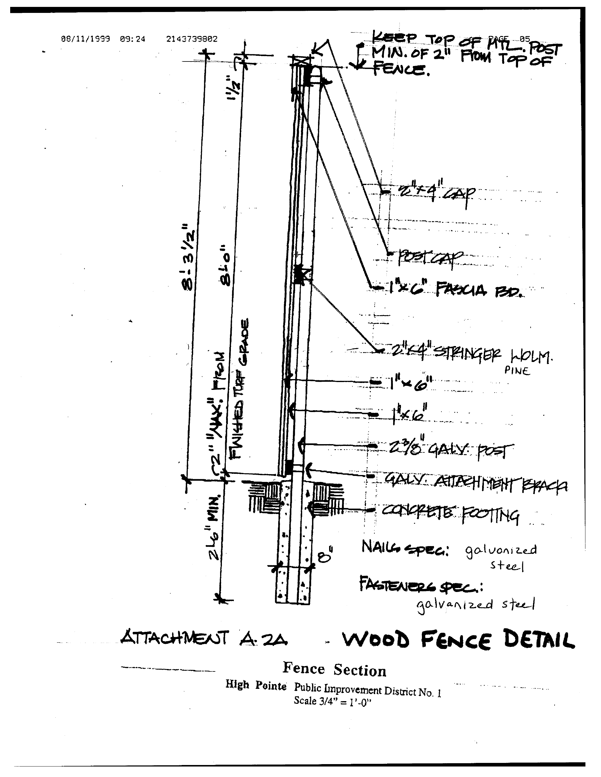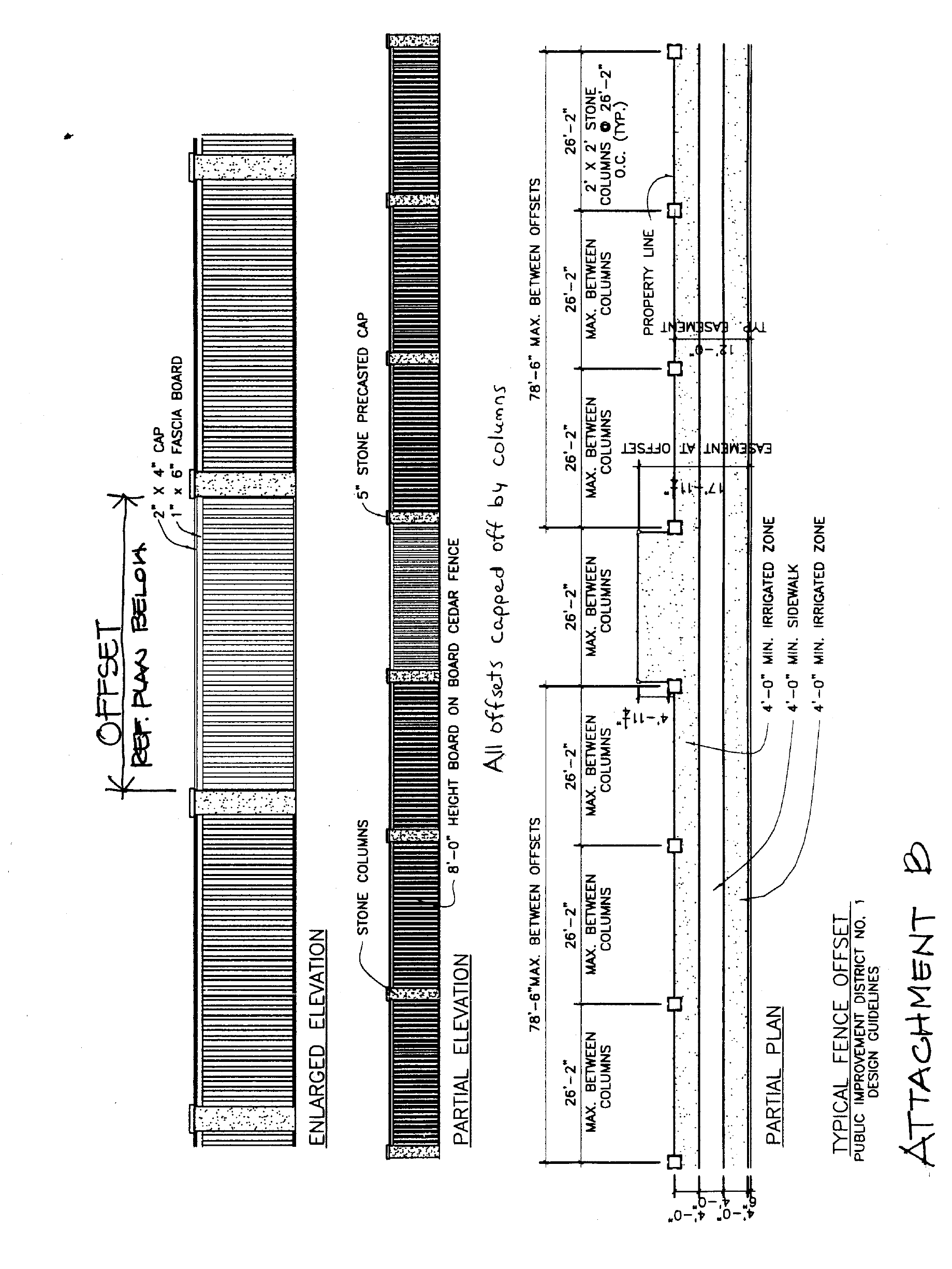 OPTION B. The uniform screening fence shall be an eight-foot board on board wood fence constructed of #1 premium grade cedar, with 2′ ⅜″ galvanized posts set on 8-foot centers, constructed with a minimum thirty-inch footing depth. The fence shall include 2′ × 2′ × 8′½″ masonry columns of Granbury stone (or approved equal) with a buff color mortar. The columns shall be placed on a maximum of twenty-seven-foot centers with a capstone cap. See Attachment A-2-A for wood fence detail and Attachment A-2-B for column detail.