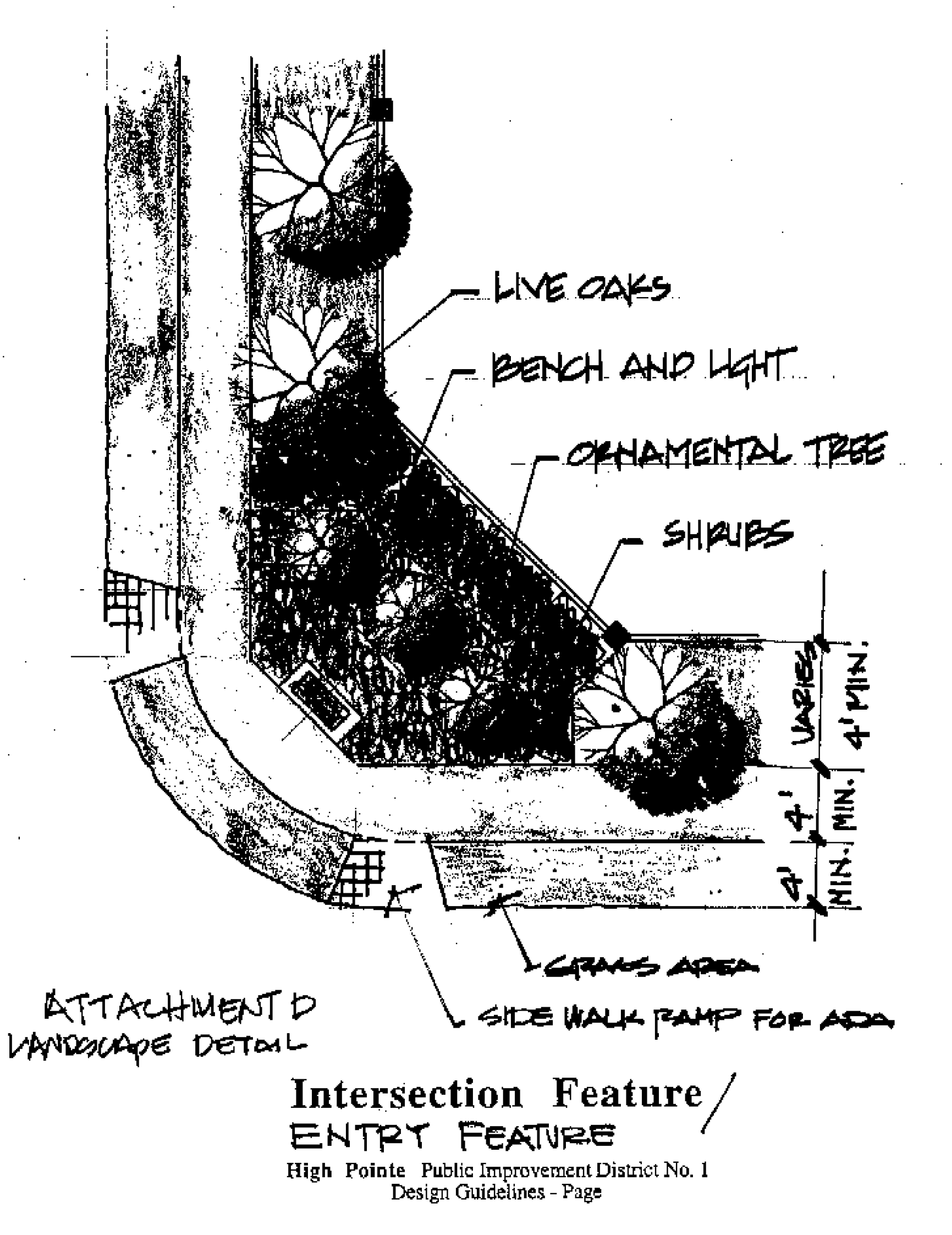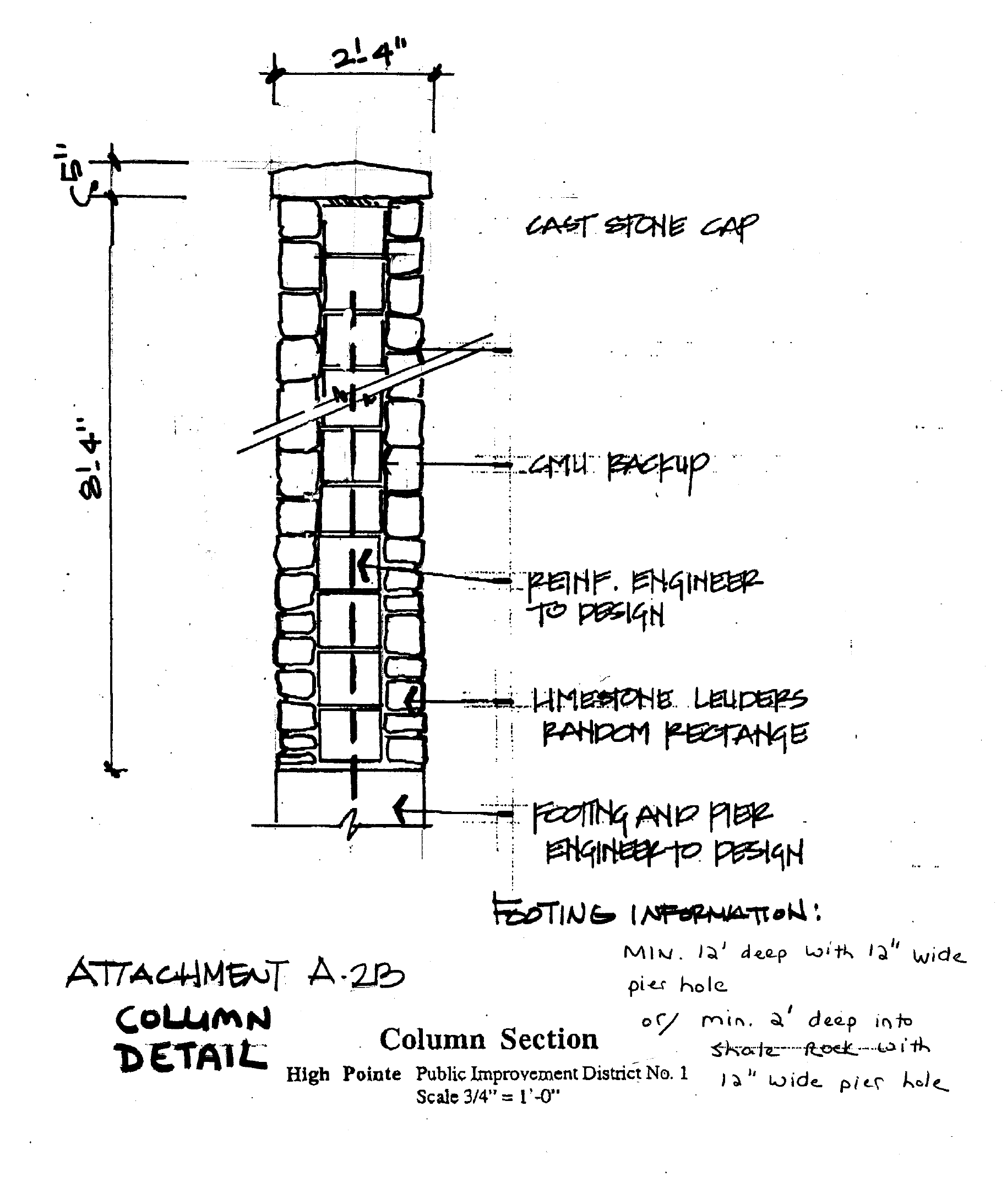 Feature sign walls, which identify the residential project, shall be constructed at each major intersection. Major intersections are defined on the map (see Attachment E). Each major intersection comer shall have one (1) feature sign wall with a landscaped bed. Each feature sign wall shall be a masonry wall, approximately 24′ × 1′ × 8′½″ constructed of Granbury stone (or approved equal) with buff color mortar. The feature sign wall shall contain a 2′ × 8′ cast stone sign with the name of the development in large letters with "at High Pointe" below in smaller letters. Feature sign wall shall be illuminated by upright from the grade in front of the wall. All electrical work needed to operate the feature sign wall lighting shall be provided by the developer. Feature sign walls shall be installed with a concrete foundation and quality stone masonry. See Attachment "C" for feature sign wall detail. All major intersection feature sign walls shall be constructed in fence and landscaped easements granted to the district for maintenance purposes.