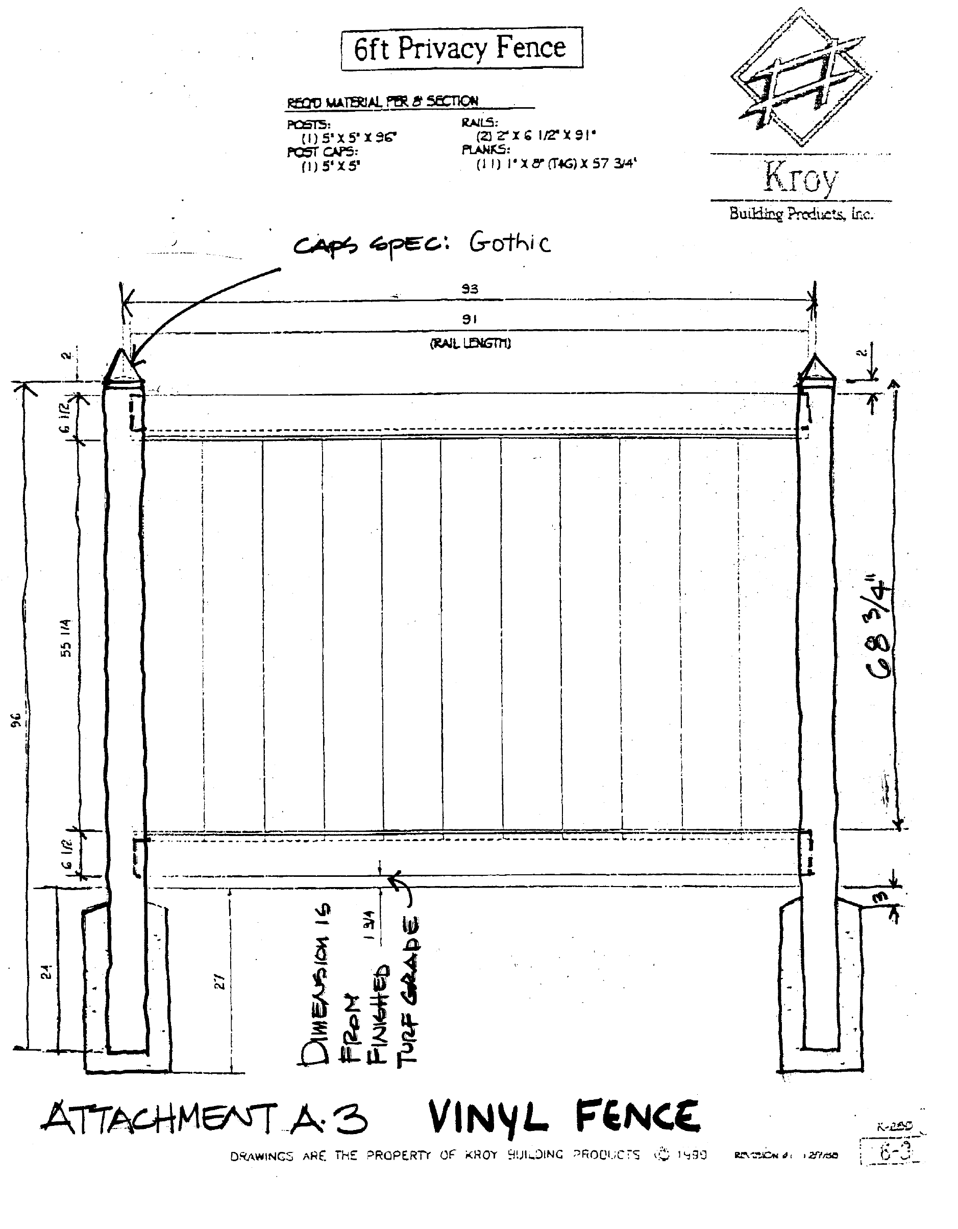 OPTION C. The uniform screening fence shall be an eight-foot tan vinyl privacy fence constructed of a quality, durable PVC vinyl material. The fence shall include 2′ × 2′ × 8′½″ masonry columns of Granbury stone (or approved equal) with a buff color mortar. The columns shall be placed on a maximum of twenty-seven-foot centers with a capstone cap. See Attachment A-3 for vinyl fence detail and Attachment A-2-B for column detail.