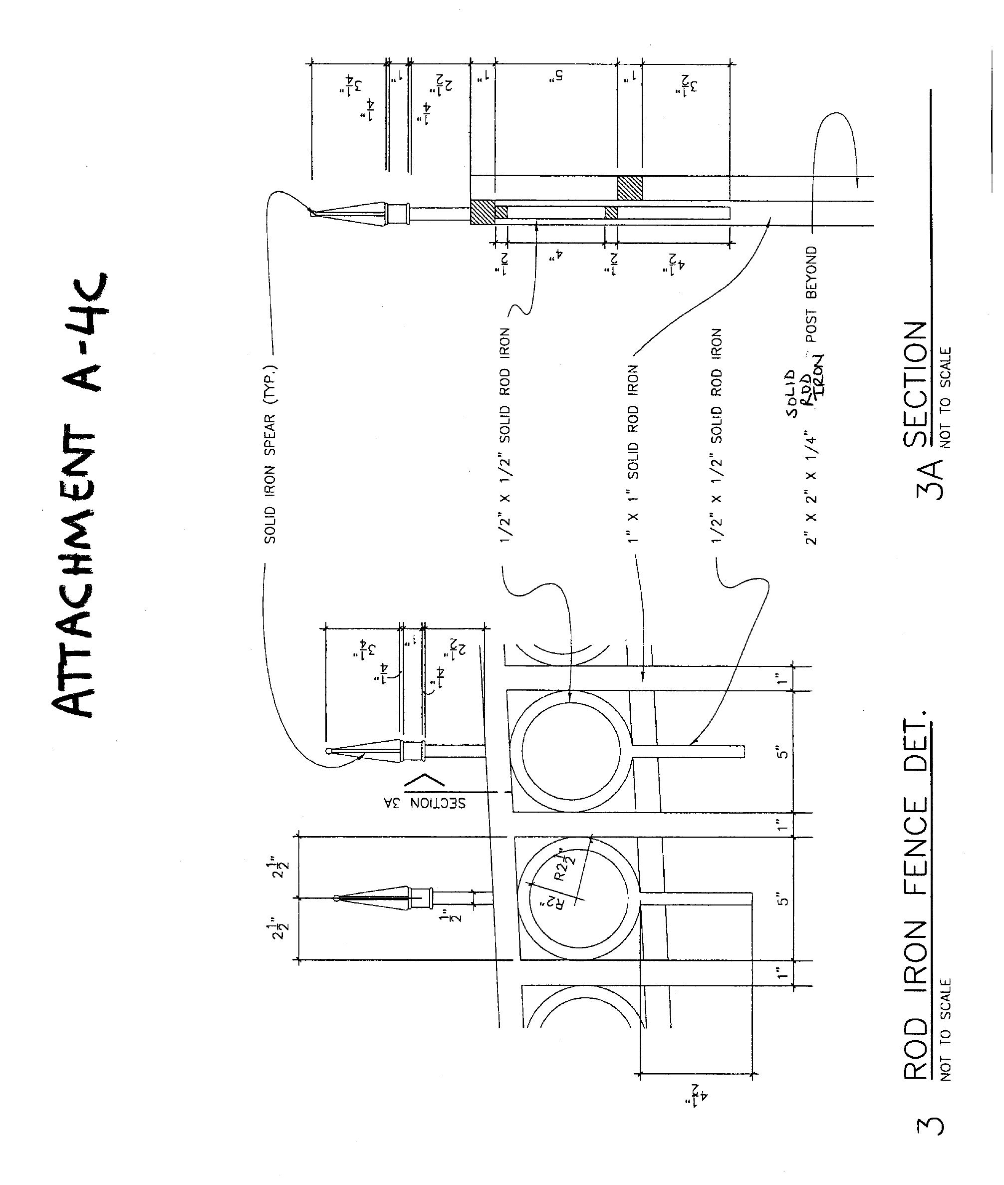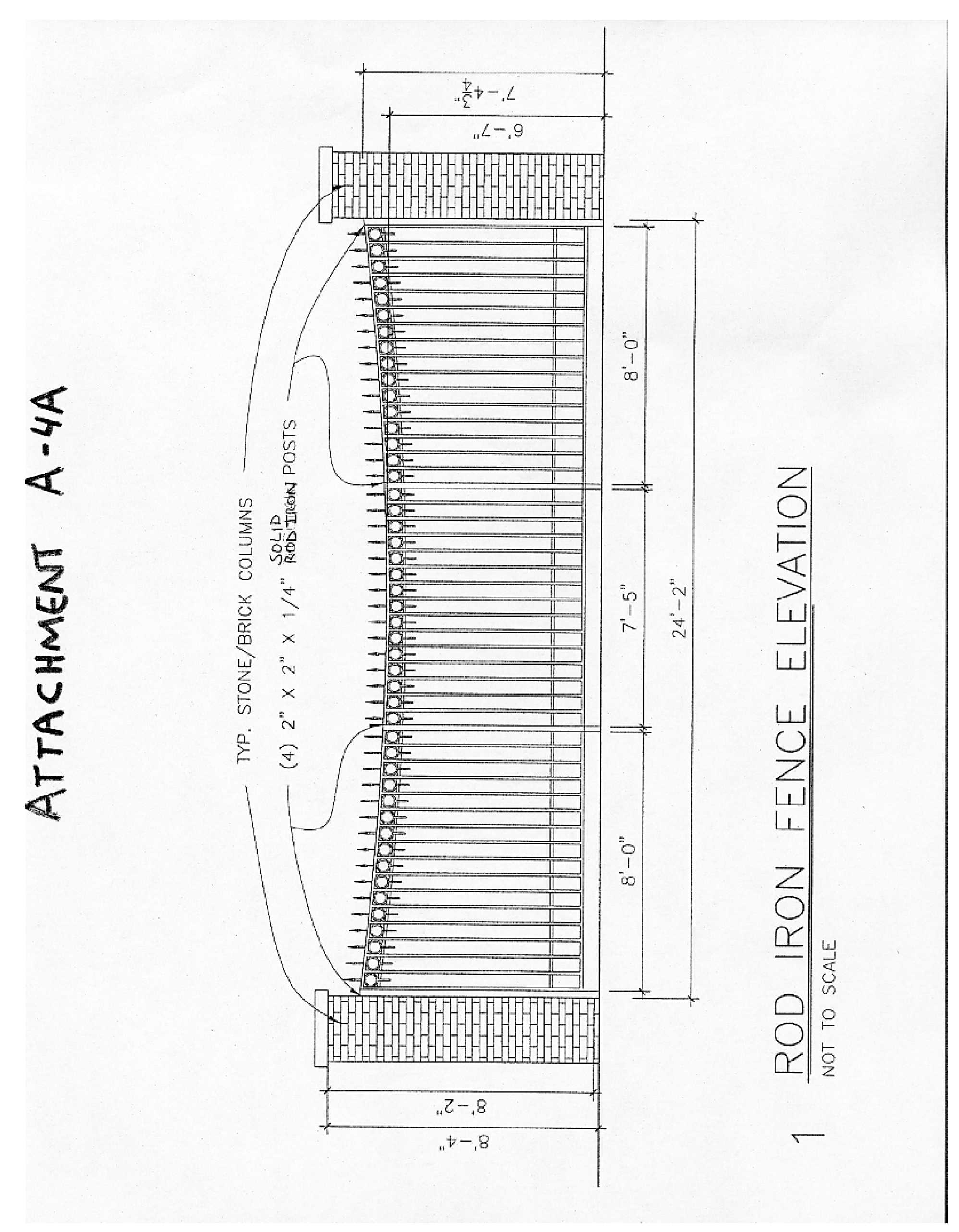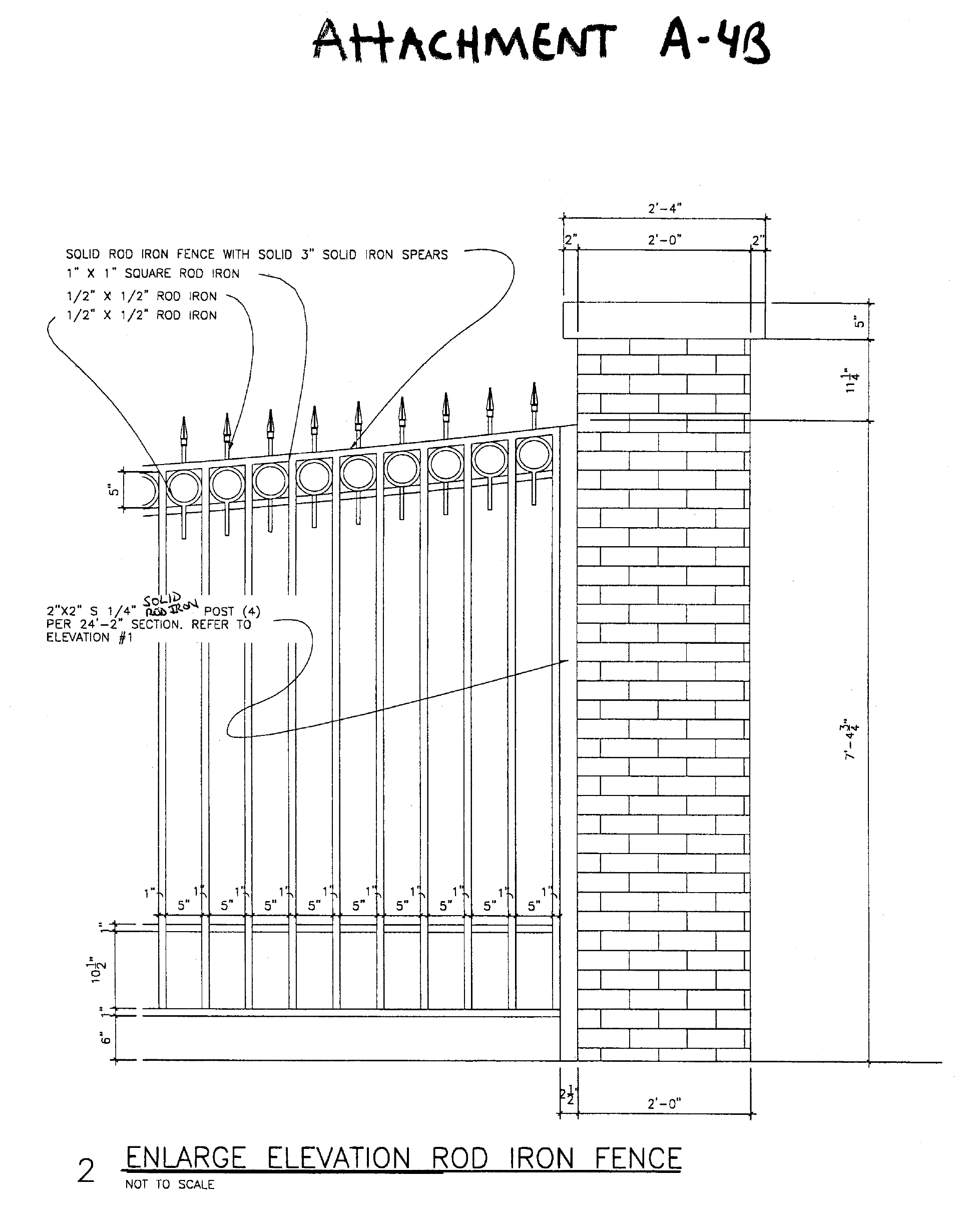 OPTION D. The uniform alleyway screening fence shall be a six-foot solid wrought iron fence (no tubular) with solid wrought iron spears with 2′ × 2′ × 6′½″ masonry columns of Granbury stone (or approved equal) with buff color mortar. See Attachment A-4 for wrought iron fence detail and Attachment A-2-B for column detail. A screening hedge shall be installed adjacent to and along the entire wrought iron fence. The screening hedge shall be a dense, evergreen hedge that is locally adaptable and drought tolerant. Plant material shall be able to achieve a minimum height of four (4) feet within three (3) years of planting. An underground automatic electric controlled irrigation system shall be provided along all required alleyway screening fences.