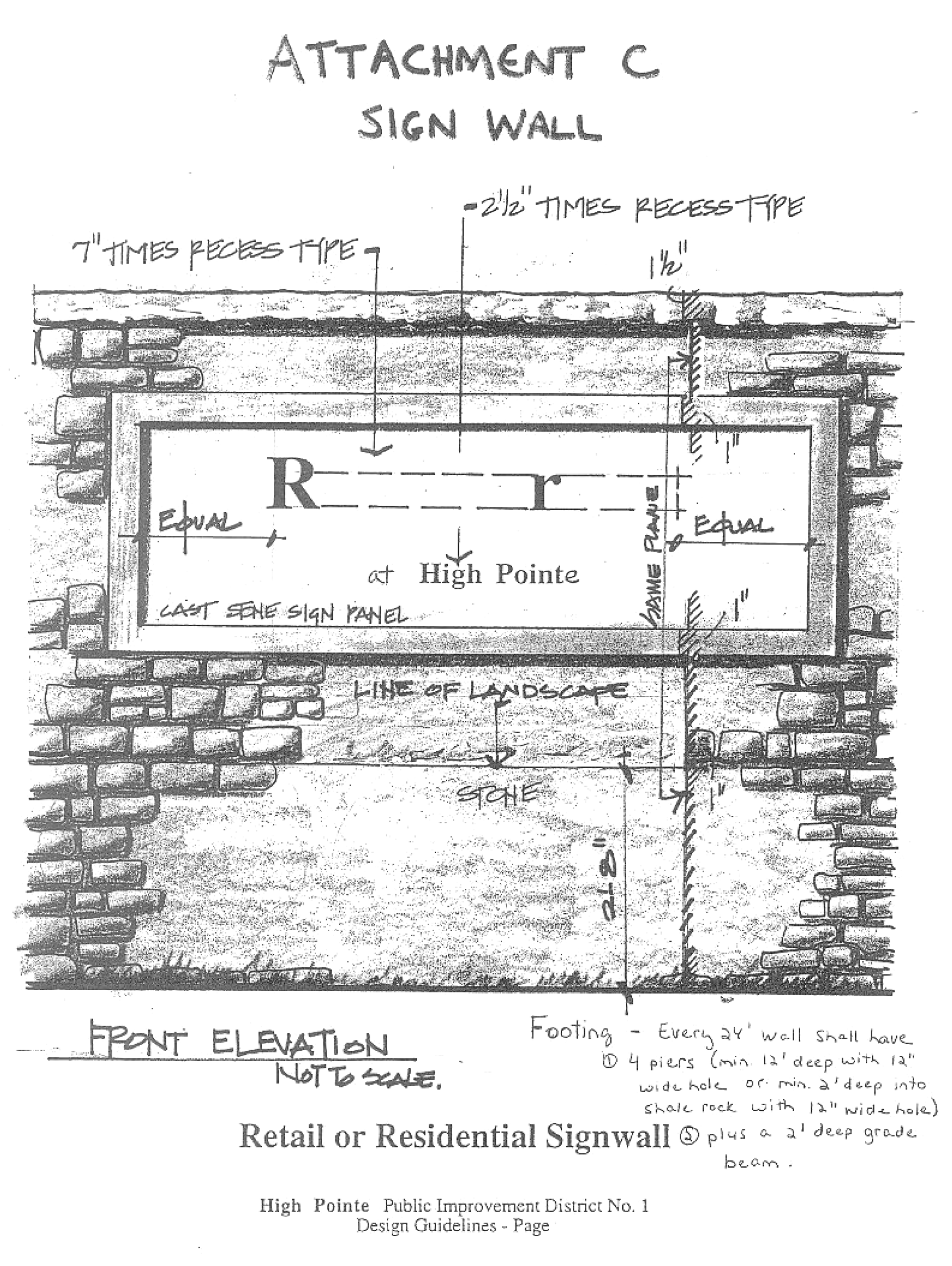 Entry signs, which identify the residential project, shall be constructed at each major addition entryway. There shall be defined by the developer at least one (1) major addition entryway for approximately every twenty (20) acres. Each major addition entryway shall have two (2) entry sign walls, one (1) on each comer of the entry into the addition. Each entry sign wall shall be a masonry wall, approximately 24′ × 1′ × 8′½″, constructed of Granbury stone (or approved equal) with buff color mortar. The entry wall shall contain a 2′ × 8′ cast stone sign with the name of the development in large letters with "at High Pointe" below in smaller letters. Sign wall shall be illuminated by upright from the grade in front of the wall. All electrical work needed to operate the sign wall lighting shall be provided by the developer. Sign walls shall be installed with a concrete foundation and quality stone masonry. See Attachment "C" for sign wall detail. All entry sign walls shall be constructed in fence and landscape easements granted to the district for maintenance purposes.