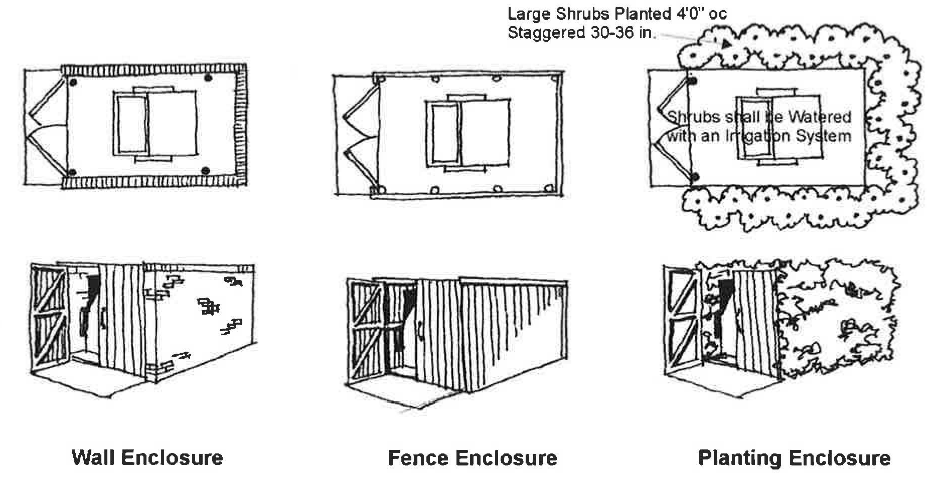 Facing an existing or future public right-of-way that is within one hundred (100) feet; facing an existing or future park or trail that is within one hundred (100) feet; or facing a residential district or a portion of a planned development district designated for residential uses that is within one hundred (100) feet where a screening wall is not required; or