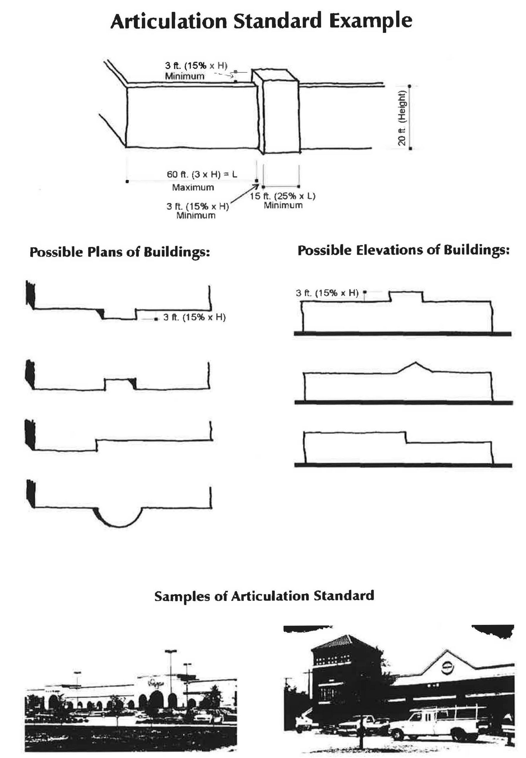 Vertical articulation. No horizontal wall surface area shall extend for a distance greater than three (3) times height of the wall without changing height by a minimum of fifteen (15) percent of the wall's height. This height change shall continue for a minimum distance equal to at least twenty-five (25) percent of the maximum length of either adjacent plane.