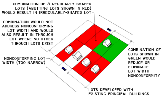The combination of lots would result in regularly shaped lots being combined into a single lot with an irregular shape (see Figure 12-12-304, Combination of Nonconforming Lots); or