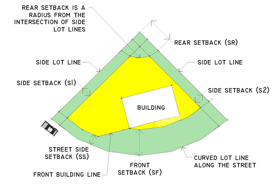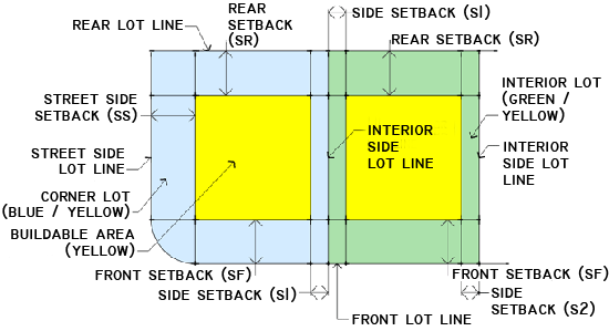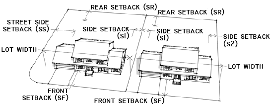 Side setbacks (abbreviated "S1" and "S2") are measured from side lot lines. Side lot lines are lot lines that intersect with front lot lines.