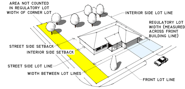 Corner Lots. Lot width (for regulatory purposes) is the distance from the interior side lot line to the street side lot line, measured at the front building line, minus the difference between the required street side setback and the required interior side setback. In simplified terms, regulatory lot width = actual lot width - street side setback + interior side setback. See Figure 12-3-203B, Measurement of Lot Width; Corner Lots.