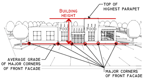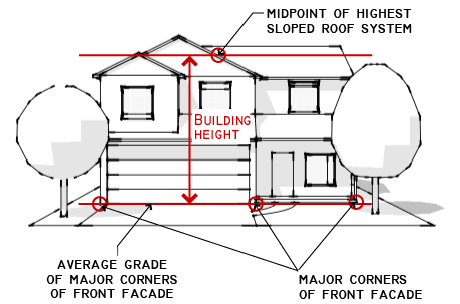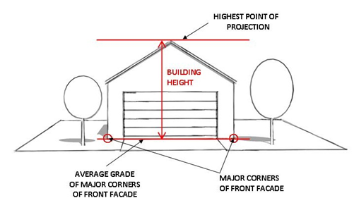 Detached Garages and Accessory Buildings. Building height is measured from the average existing grade across the front building line ("point of measurement"), measured at major corners of the building to the highest point of projection of the roof systems.