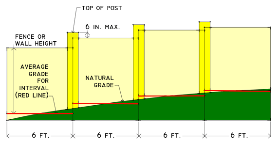 Fences and Garden Walls. The height of fences and garden walls is calculated by measuring the vertical distance from the average finished grade on the outside of the enclosed area (or the side closest to the property line if the fence does not enclose anything) to the top of the fence, at six-foot intervals as appropriate to topography. Fence posts may exceed the height of the highest connected portion of the fence by up to twelve (12) inches.