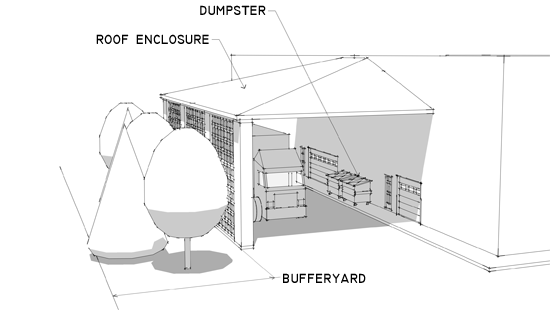 The loading, truck access, or waste storage area is located under roof as indicated in Figure 12-3-808B, Roof Enclosure. If this option is used, the buffer along the length of the loading shed may be reduced by 10 percent opacity.