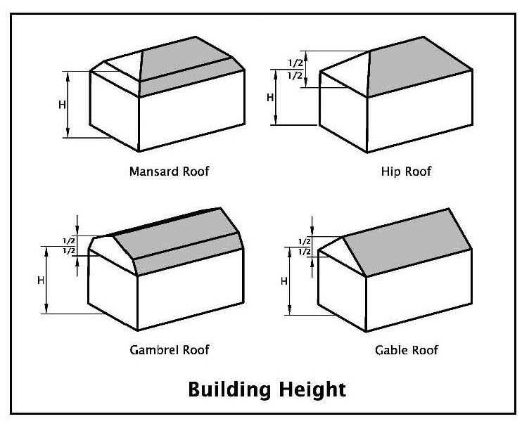 Building height: Is the vertical distance measured from the established grade to the highest point of the roof surface for flat roofs; to the deck line of mansard roofs; and to the average height between eaves and ridge for gable, hip, and gambrel roofs; and to the average height between the lowest point and the highest point on a shed roof. Where a building is located on sloping terrain, the height may be measured from the average ground level of the grade at the building wall. (See the diagram.)
