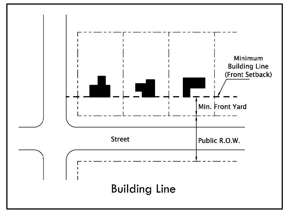 Building line: Is a line formed by the face of the building; and for the purposes of this ordinance, a building line is the same as a front setback line. (See the diagram.)