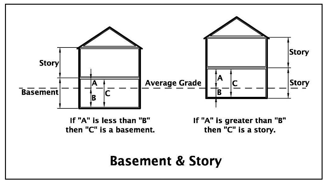 Basement (cellar): That portion of a building which is partly or wholly below grade but so located that the vertical distance from average grade to the floor is greater than the vertical distance from the average grade to the bottom of the joists supporting the ceiling. A basement shall not be counted as a story. (See the diagram.)