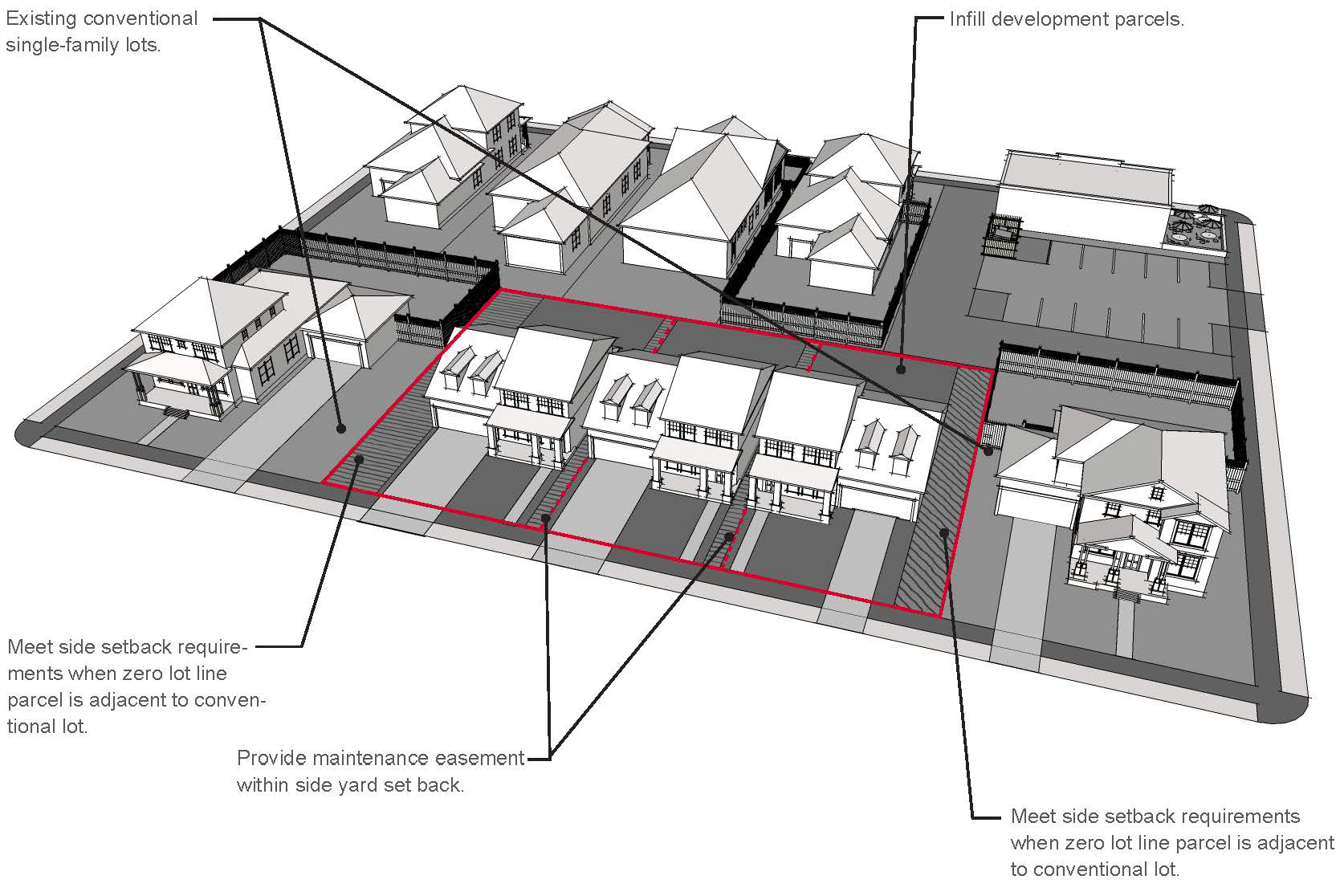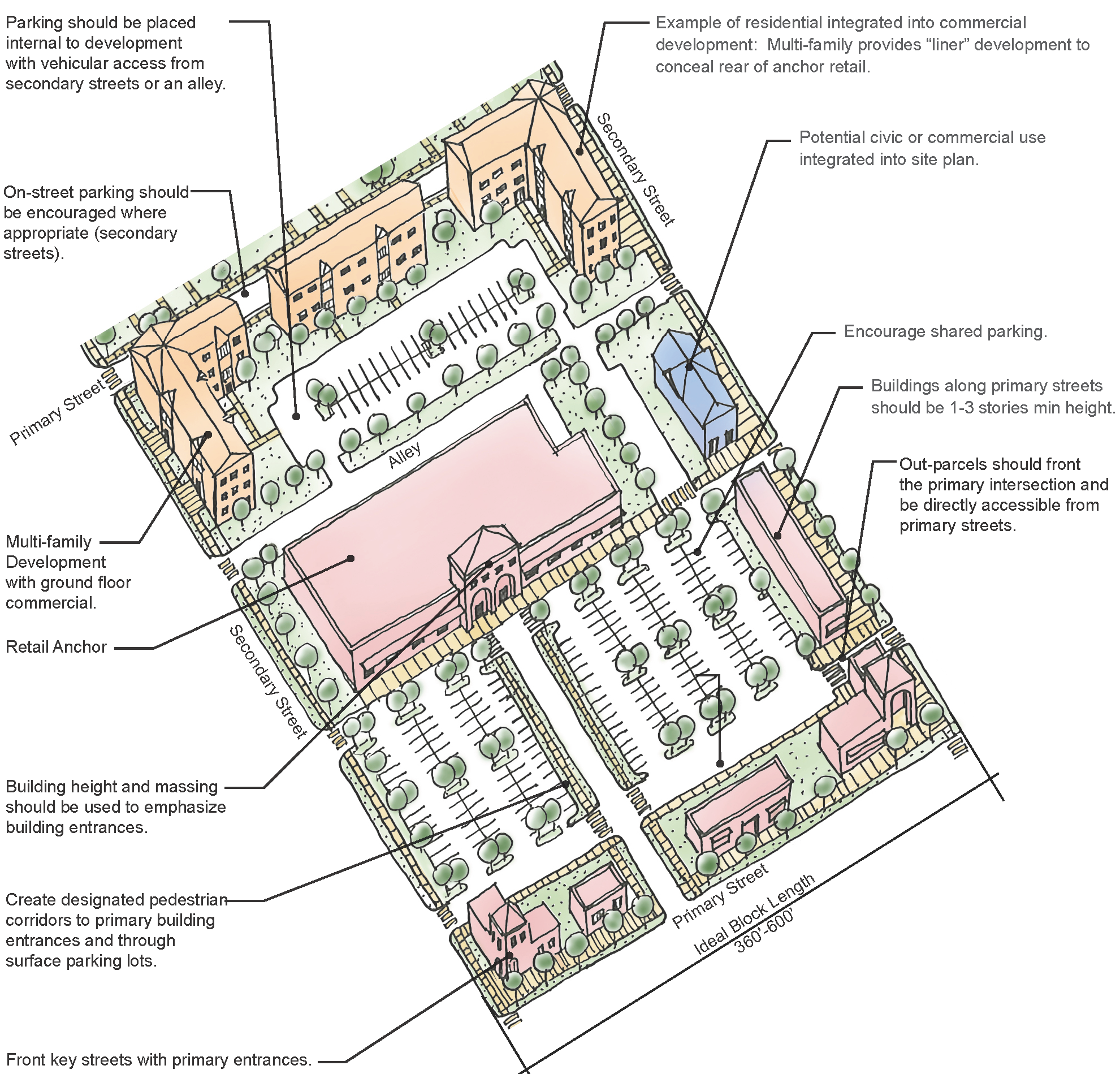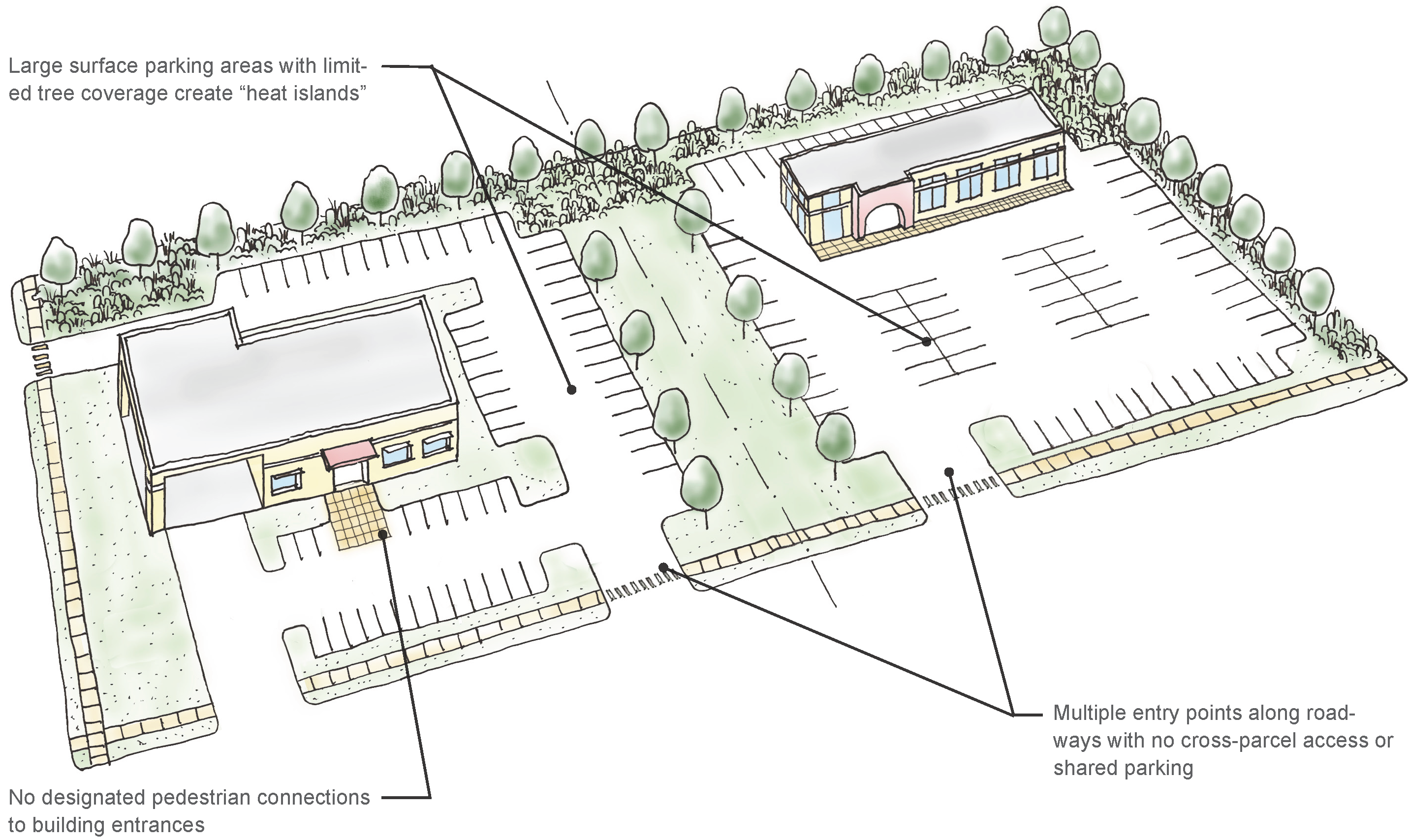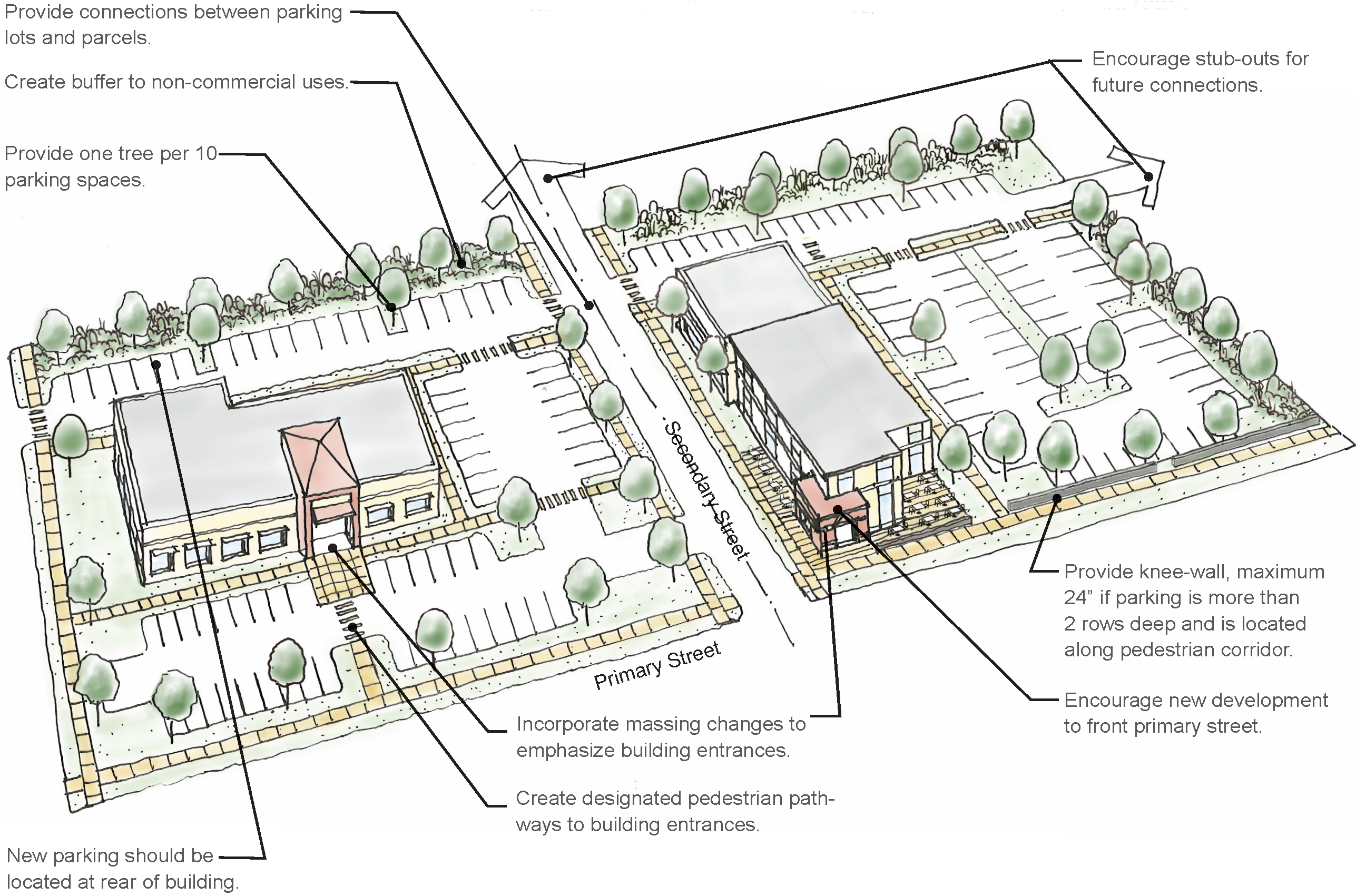 Shared access and parking are encouraged, with stub-outs for future connections when adjacent to undeveloped parcels that could be redeveloped.