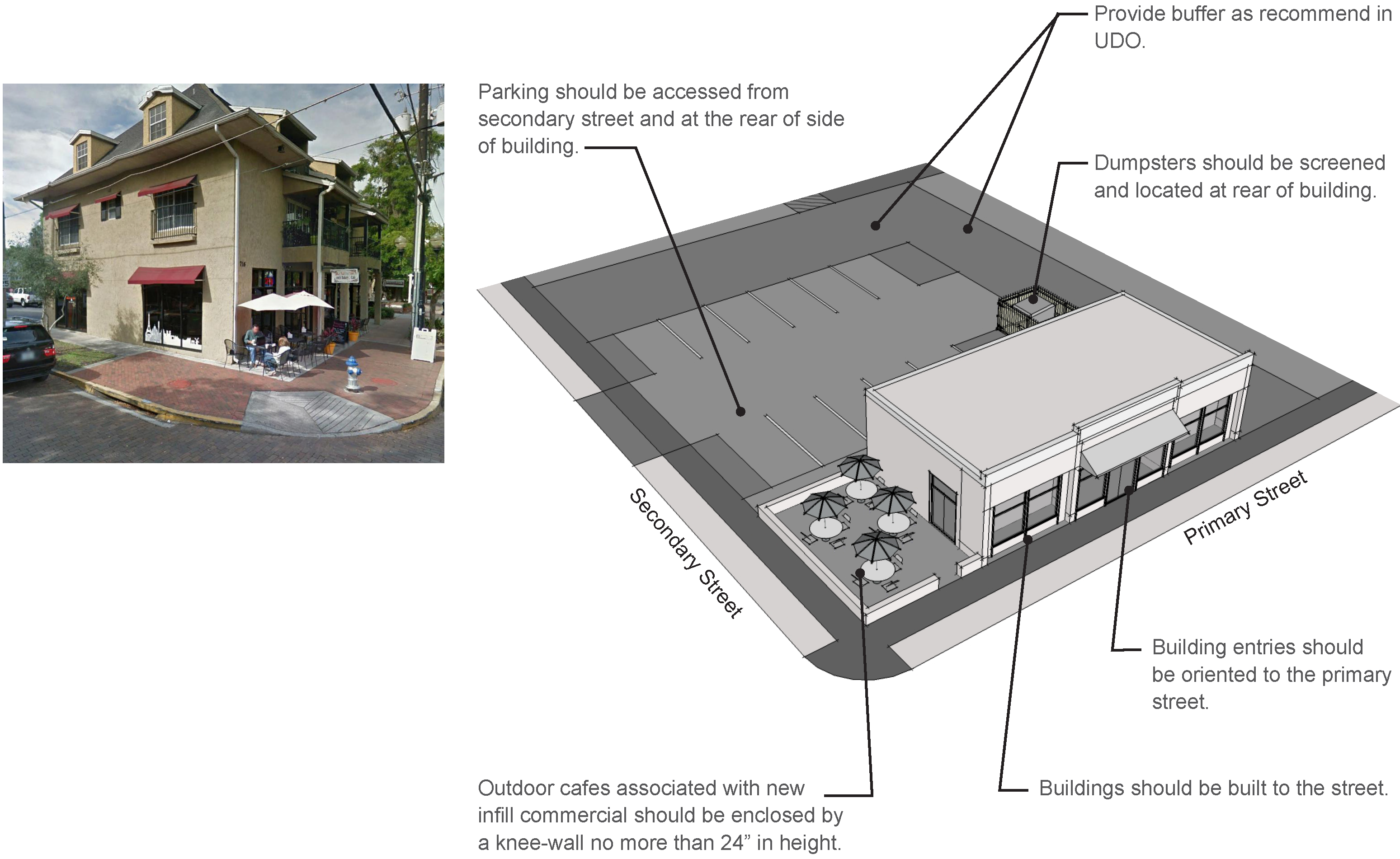 Primary streets should have building frontage-"built-to the street"-with parking located behind the building.
