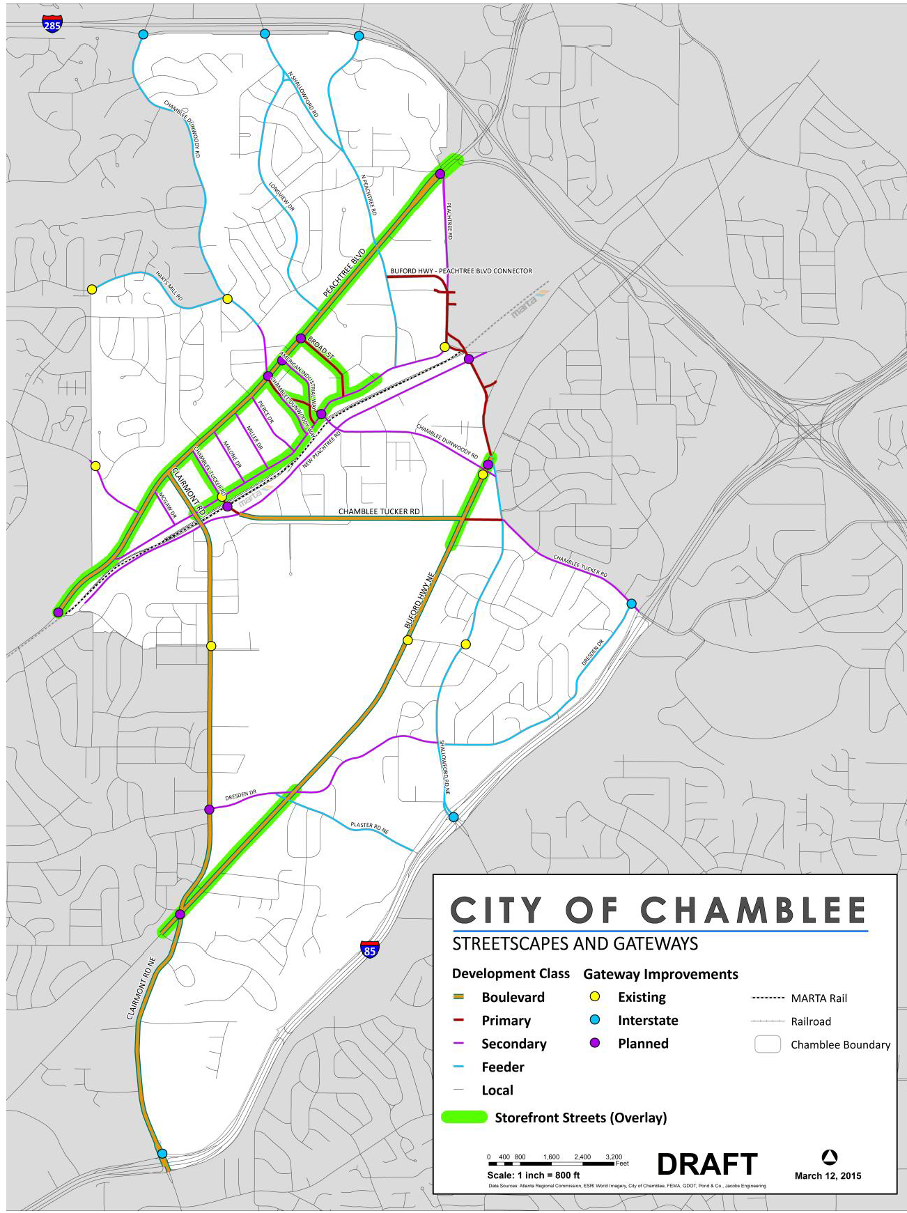 In accordance with the Unified Development Ordinance (UDO), the dimensions of all landscape zones, sidewalks, minimum building façade heights and front yards are governed by the street designation that the lot fronts on, in order to ensure consistency and application of the streetscape requirements. The street designations of all public streets are defined in Chapter 350 of the UDO, and are illustrated in the City of Chamblee Comprehensive Plan on the "Streetscape and Gateways Map." A reduced copy of this map is on the following page, and a poster sized copy of the map is available on the city website at www.chambleega.gov.