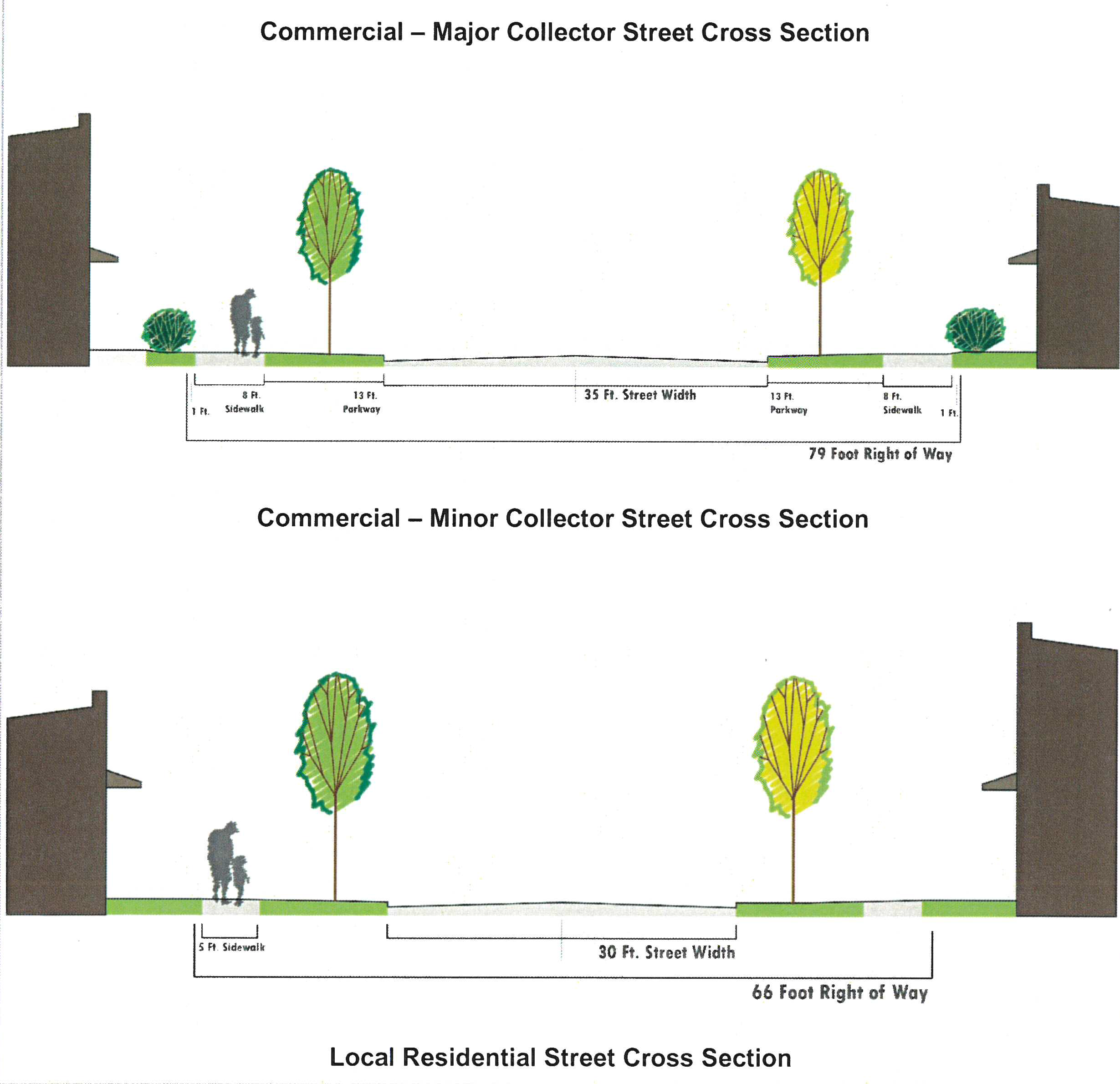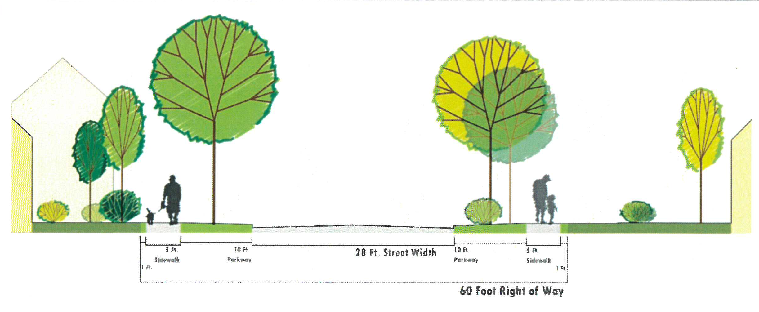 No shrubs shall be allowed in the setback area. Only trees from the plant list in the technical appendix may be planted in the setback area. The setback area must be covered with groundcover, non-living decorative material such as bark, woodchips, decorative rock or stone, or other similar materials. Garden plots, alternative landscapes, and walkways are permitted within the setback area.