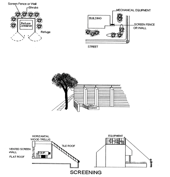 Screening of service yards, refuse, and waste-removal areas, loading docks, truck parking areas, and other areas which tend to be unsightly shall be accomplished by use of walls, fencing, dense planting, or any combination of these elements. Screening shall block views from public right-of-way (pedestrian views) and shall be equally effective in winter and summer.