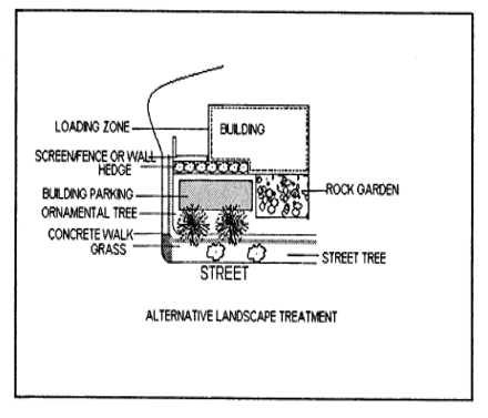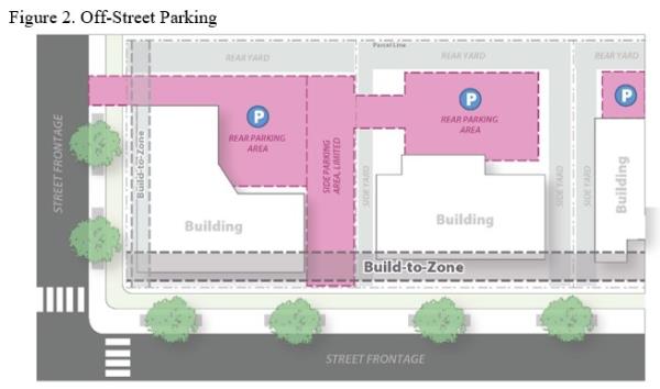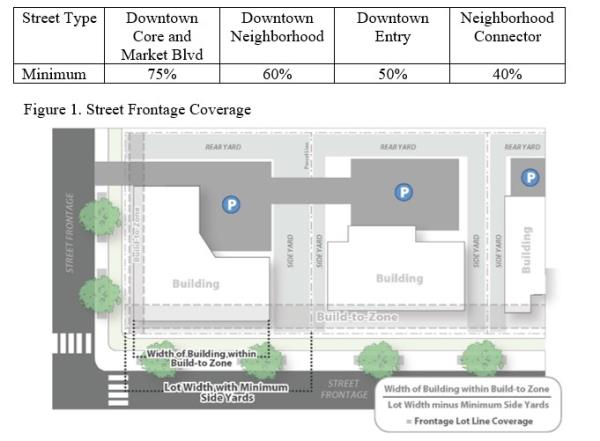 1) Street frontage coverage: A minimum percentage of all building fronts are required to be placed within a lot’s build-to-zone. To determine compliance with the street frontage coverage requirement, the total length of the building or building portion(s) located in the build-to-zone is divided by the length of the lot or parcel on which the building is located. The remainder of a building may be placed outside the maximum front setback but shall not be located closer to the street than the minimum front setback.