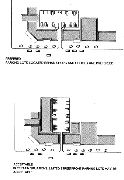 i) For Downtown Core Streets and Downtown Neighborhood Streets, including future downtown street extensions, off-street parking areas shall not be permitted between the building and the street unless approved by the City due to unique site circumstances which shall include but are not limited to, existing access easements or parking easements.
