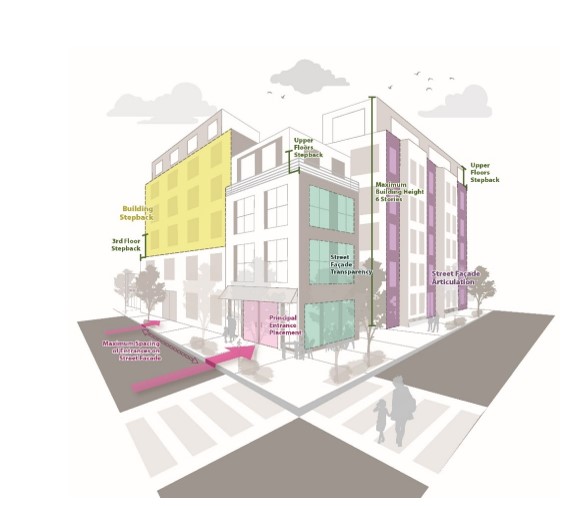 2) Lower and Upper Floor Stepbacks: Portions of the building’s lower and upper floors shall be stepped back from the ground floor façade along street frontages a minimum of 5 feet. Lower and upper floor stepbacks shall provide vertical articulation to ground floor commercial spaces and architectural design features and/or provide vertical relief for the adjacent pedestrian environment as deemed appropriate by the City.