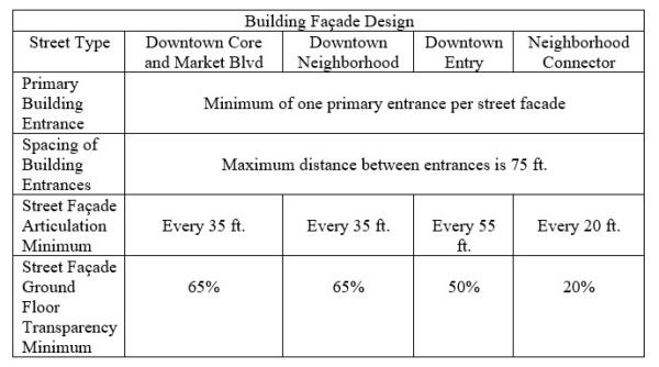 1) All buildings shall be constructed to meet the building façade standards in the following table: