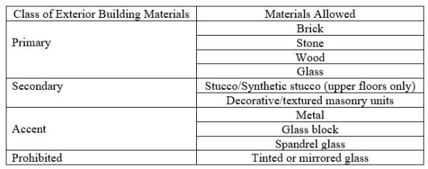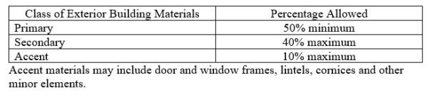 1) Exterior building materials are classified as primary, secondary or accent materials and are allowed as follows: