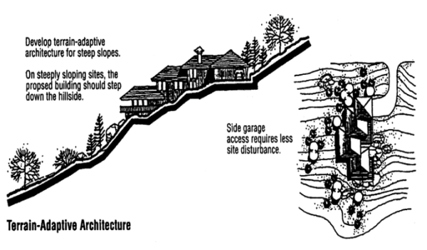 Through environmentally sensitive design such as "terrain adaptive architecture" (see Figure 1), landscaping and site planning, site views both to and from the BCO district shall be preserved and enhanced to the greatest extent possible so as to maintain views that reflect and protect the natural beauty of the BCO district. Special attention should be given to views that are highly accessible to the public such as scenic overlooks, ridges and trails. Clustering of development away from natural overlooks is encouraged.
