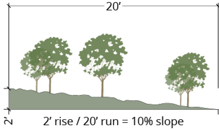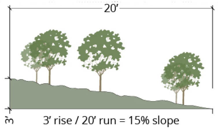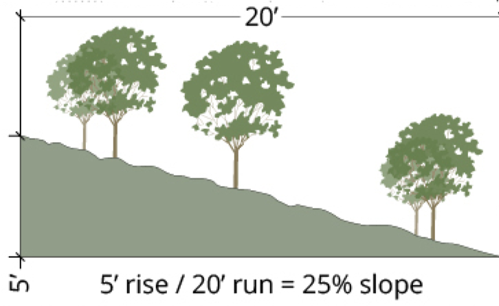 Definitions. For purposes of this section, "slope" means the ratio of elevation change to horizontal distance, expressed as a percentage. Slope is computed by dividing the vertical distance ("rise") by the horizontal distance ("run"), and multiplying the ratio by one hundred (100). A "steep slope" is equal to or steeper than fifteen (15) percent.