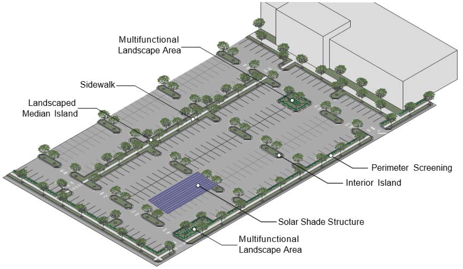 The design of street systems and regulation of traffic are described in section 5.8. This includes not only vehicular access, but also facilities for pedestrian and bicycle access. Section 5.9 establishes both a minimum and a maximum amount of vehicle parking spaces that must accompany new development.