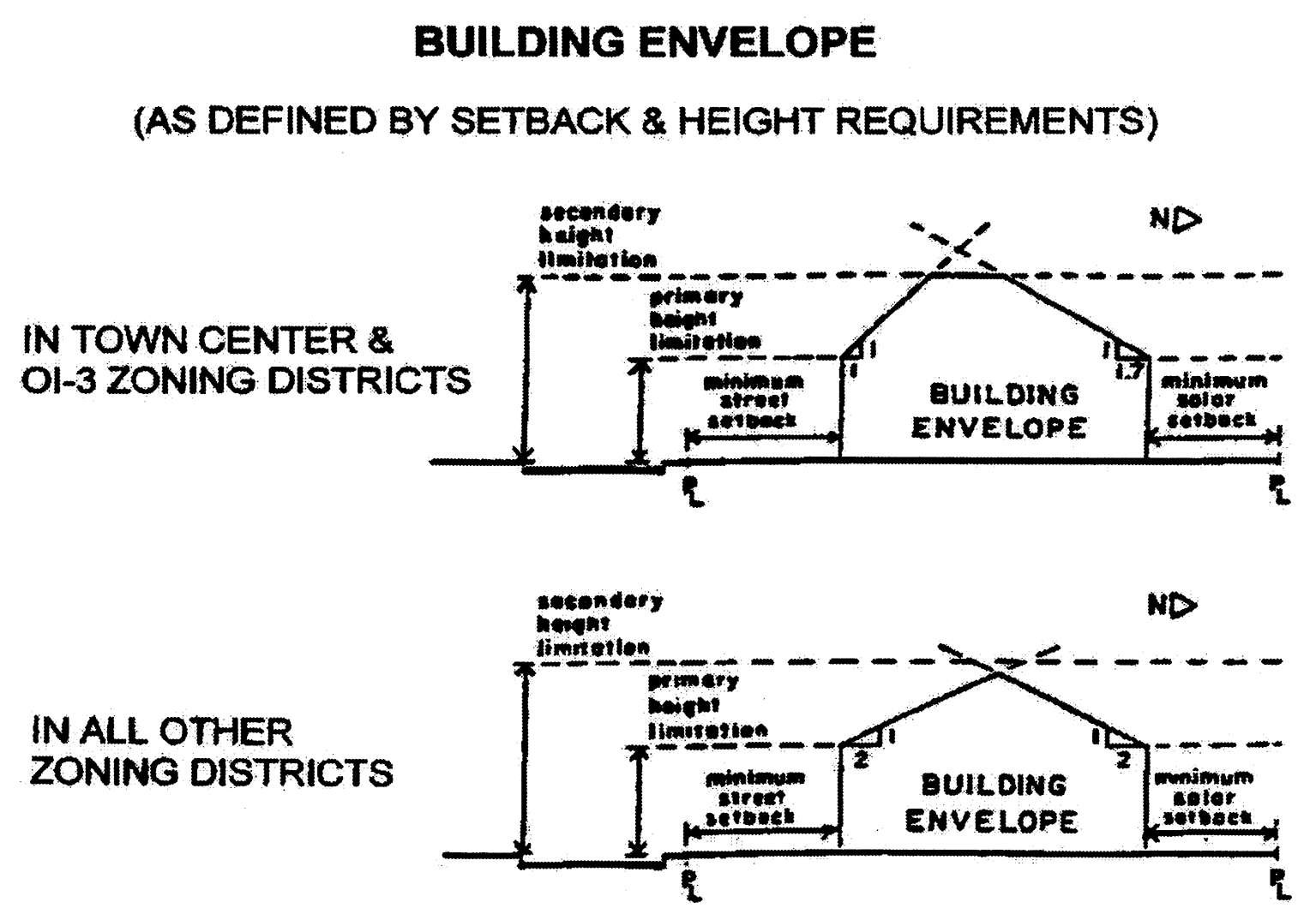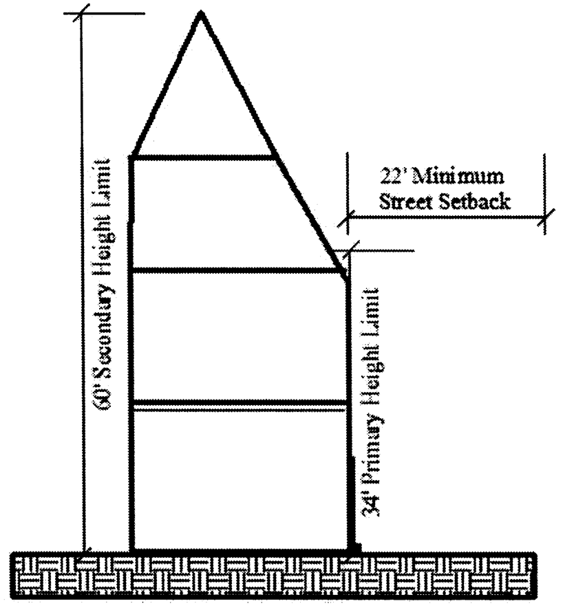 Building envelope: The three-dimensional space within which a structure is permitted to be built on a zoning lot, and which is defined by setback and height regulations. Divisions 3.8.2(f) and (g) regulate the setback height and core height, respectively, which together define the vertical extent of the building envelope. Divisions 3.8.2(h)—(j) regulate the street, interior, and north setback lines, respectively, which together define the perimeter setbacks and horizontal extent of the building envelope.