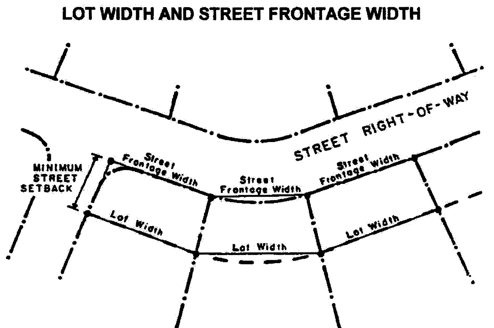 Street frontage width: The horizontal distance measured along a straight line connecting the points at which the street lot line abutting a street intersects with interior lot lines and/or other street lot lines.