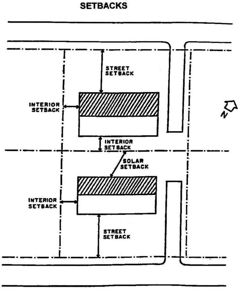 Setback, solar: The horizontal distance between the north lot line of a zoning lot and any structure on such zoning lot, measured along the north/south axis in a southerly direction from the north lot line. A north lot line shall be construed to include any portion of a lot's lot line which has an alignment within forty-five (45) degrees of an East/West axis.