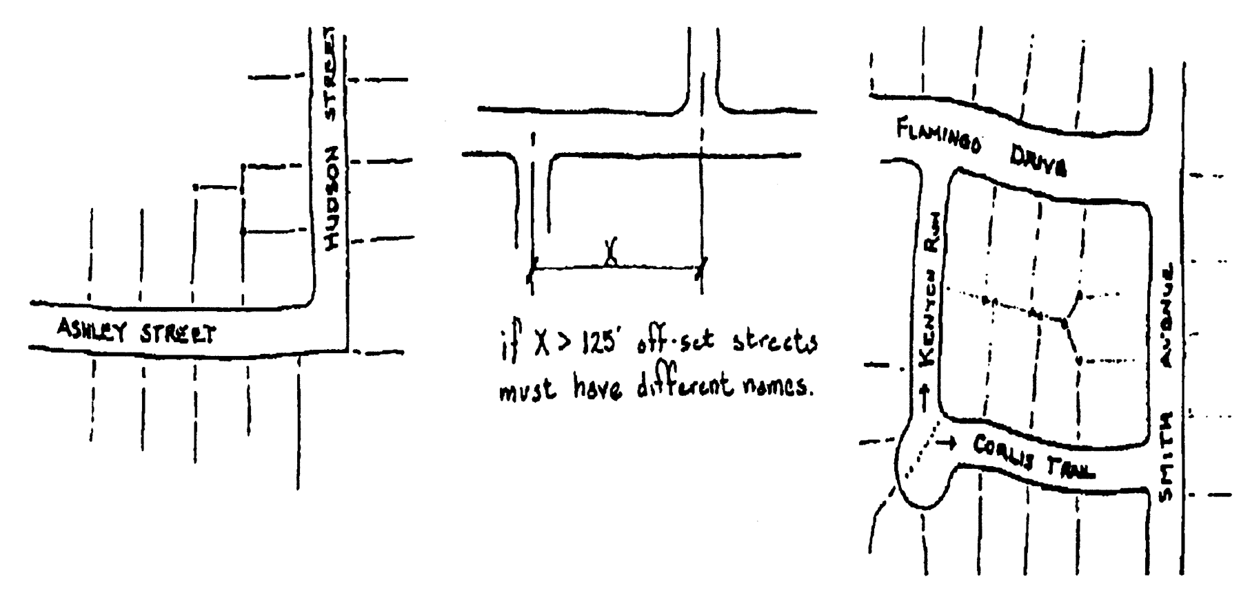 Street names shall not change within a street. Extensions of existing streets should use the same name as the existing street. Streets should not change names except in the following circumstances: (offsets and 90 degree turns)