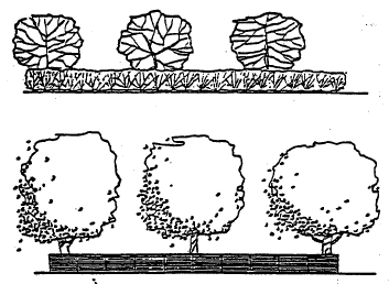 If trees are used in combination with shrubs, they may be of any species from the list provided by the Zoning Administrator. Small trees shall be planted thirty (30) foot on center, and large trees forty (40) foot on center as shown in the following illustration. Shrubs shall be any evergreen species from the list provided by the Zoning Administrator planted four (4) feet on center as shown in the following illustration. Shrubs shall initially be of any size, which would normally attain a minimum height of six (6) feet within three (3) years after planting.