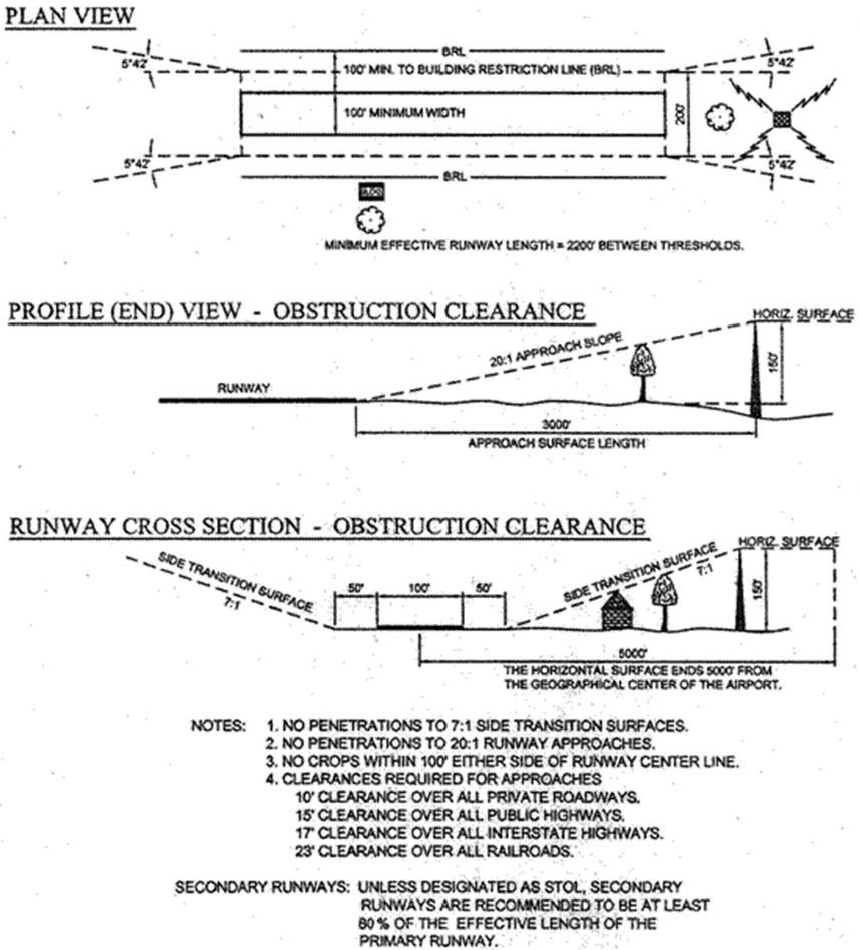 Runway cross section—Obstruction clearance—This illustrates the view from one end of the runway and the side transition surfaces rising on either side of the runway. Beginning 100 feet from the centerline of the runway, the side obstacle maximums increase in a 7:1 slope. For each seven feet, the obstacle maximum height increases by one foot until it reaches a maximum height of 150 feet. The 150 feet maximum height continues to 5,000 feet from the geographical center of the airport.