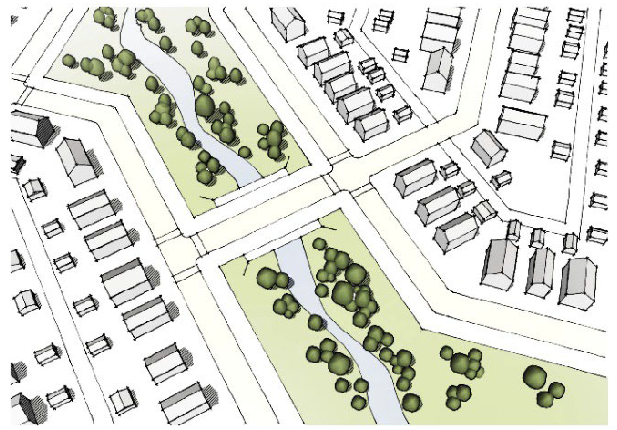 Except for agriculture, open space must not be isolated. Pedestrian circulation networks must provide access from the open space to existing and proposed thoroughfare networks, both inside and outside of the district.
