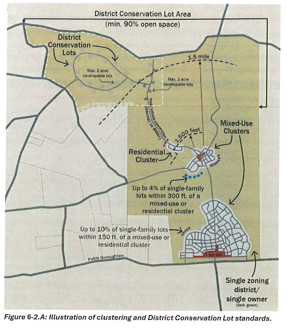 No district conservation lot areas may be platted before a mixed-use cluster located within 1.5 miles in the same hamlet (HM) or village (VL) district meets all the following: