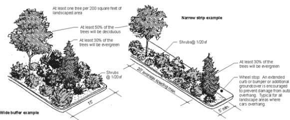 A mix of evergreen and deciduous trees and shrubs generally interspersed throughout the landscape strip spaced to create a filtered screen;