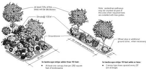 Trees provided at the rate of one per 100 square feet or one per ten linear feet, whichever is greater, of landscape strip;