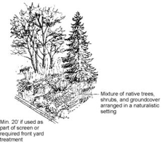 A mix of primarily evergreen trees and shrubs generally interspersed throughout the landscape strip and spaced to form a continuous screen;