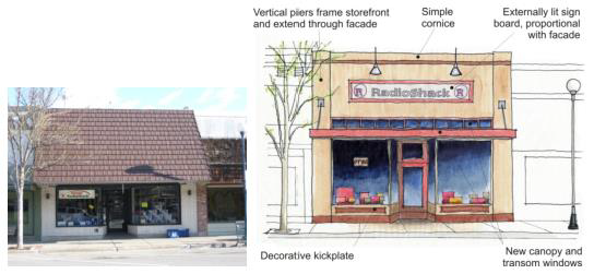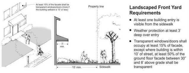 The location and design of the addition/remodel shall be consistent with landscape street frontages per section 17.14.020.D: Provide a landscaped setback, locate parking to side or rear of building addition, provide weather protection over the building entry, and meet minimum facade transparency requirement.