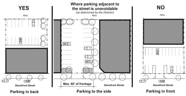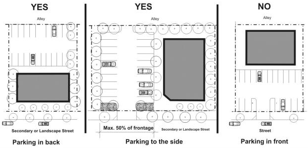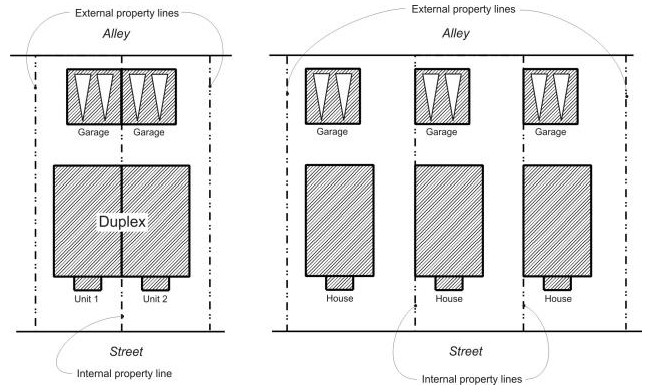 For lots without alleys, individual driveways off of the street are prohibited (shared driveways are required);