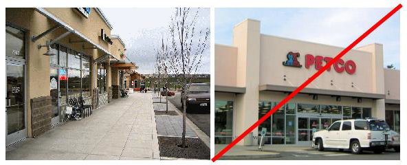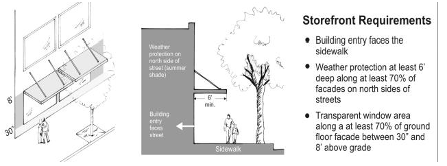 Storefront street refers to a street or segment of a street where envisioned to have storefronts placed up to the edge of the sidewalk. See Figure 2 for the location of designated storefront streets and section 17.14.020(D)(2) for the description and applicable standards for properties fronting on designated storefront streets.