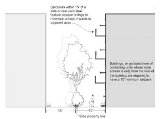 Minimum building separation along uncovered internal drive aisles shall be 25 feet. The purpose is to provide adequate vehicular turning radius, allow for landscaping elements on at least one side, and provide adequate light and air on both sides of the dwelling units and drive aisles, which often function as usable open space for residents; and