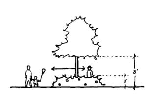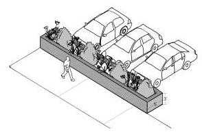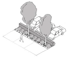 Provide a planted area in front of each pedestrian entry of at least 20 square feet in area, with no dimension less than four feet. Provide a combination of shrubs or ground cover and a street tree (refer to city arborist or street tree list if available); and