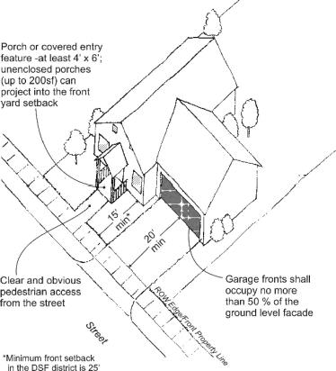 For sites without alleys or other rear vehicular access, new buildings must emphasize individual pedestrian entrances over private garages to the extent possible by using both of the following measures: