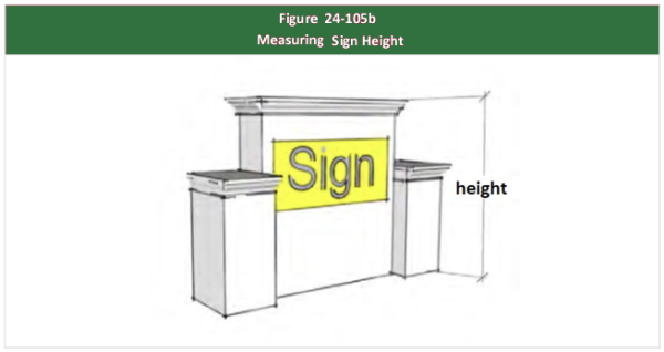 a. The height of a ground sign will be measured from the ground to the highest point of the sign structure. (See Figure 24-105b,”Measuring Sign Height”) b. The height of a wall sign will be measured from the point where the supporting wall meets the ground to the top of the highest point of the wall sign.