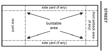 Setbacks. The zoning code requires that certain portions of a lot be set aside for front, rear and side yards. In general, no portion of a house (except covered front porches, chimneys, and bay windows) may extend up to 50 percent into these required yards. Eaves may project 30 inches into the required setback. Accessory structures and ADU's may be placed in the side or rear yards (such as garages, sheds, decks, porches or arbors) as along as adequate space is available, and certain criterion are met per CMC 21.44.