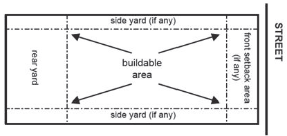 Setbacks. The zoning code requires that certain portions of a lot be set aside for front, rear and side yards. In general, no portion of a house (except covered front porches, chimneys, and bay windows) may extend up to 50 percent into these required yards. Eaves may project 30 inches into the required setback. Accessory structures and ADU's may be placed in the side or rear yards (such as garages, sheds, decks, porches or arbors) as along as adequate space is available, and certain criterion are met per CMC 21.44.